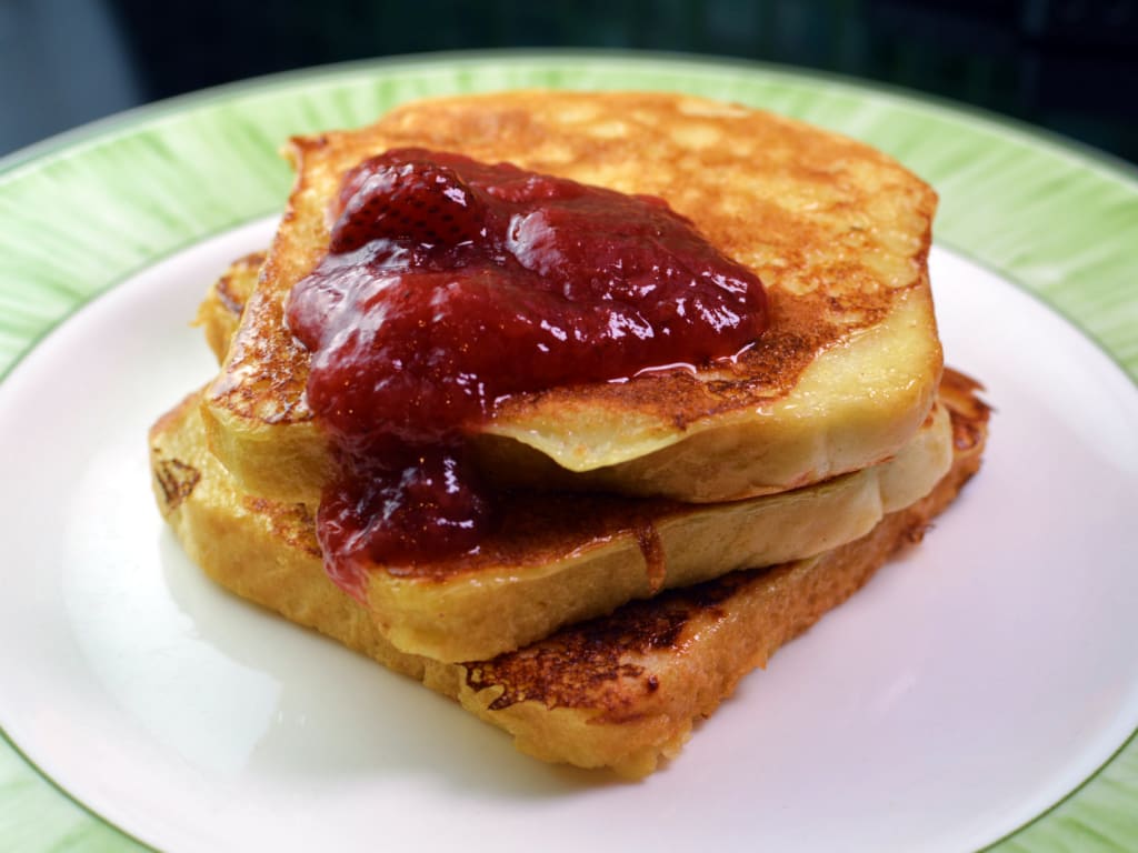 Eggy bread is the British version of French toast. This dish is also referred to as Poor Knights of Windsor. It is prepared with crustless sandwich bread, milk, icing, sugar, eggs, butter, cinnamon and usually a bit of sherry and strawberry jam. The bread gets soaked in a mixture of milk, eggs, icing sugar, and sherry then pan-fried until browned on both sides. When done the bread is sprinkled with cinnamon and sugar and topped with strawberry jam or blackberry compote.