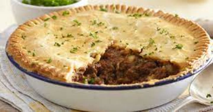 Meat and potato pie is comfort food. The pie crust is prepared with flour, beef suet, and cold water. The filling is a combination of beef or sometimes lamb chunks, onions, and potatoes. The pie is baked until golden brown and left to stand for a short time before serving. If preferred carrots can be added to the filling. It is served accompanied by red cabbage.