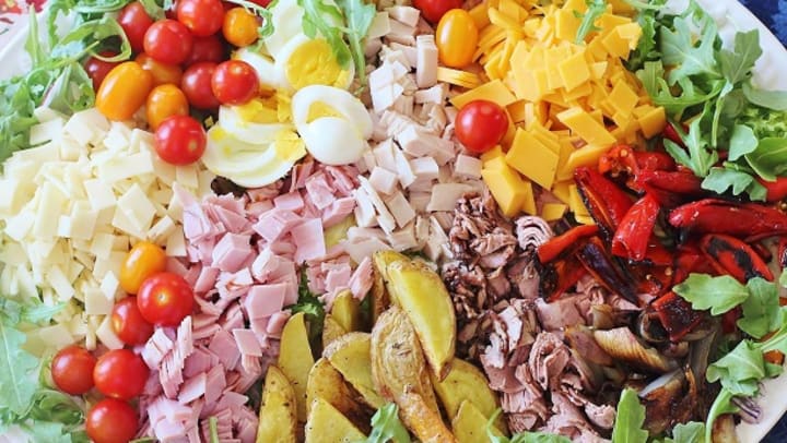 Salmagundi is a traditional cold platter dating back to the 17th century. It's usually a combination of a whole roast chicken cut into pieces, hard-boiled eggs, ham strips, anchovies, grapes, tomatoes, radishes, scallions, olives, pickled onions, celery and parsley served on a large platter.