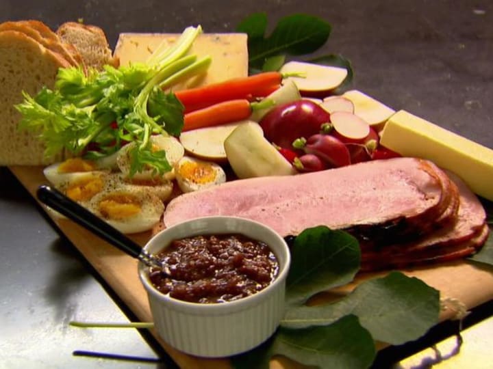 Ploughman's lunch is a meal that is made with bread, cheese, and pickles and can include sliced ham. It is often served on a wooden board in British pubs. Best when served with a glass of beer.