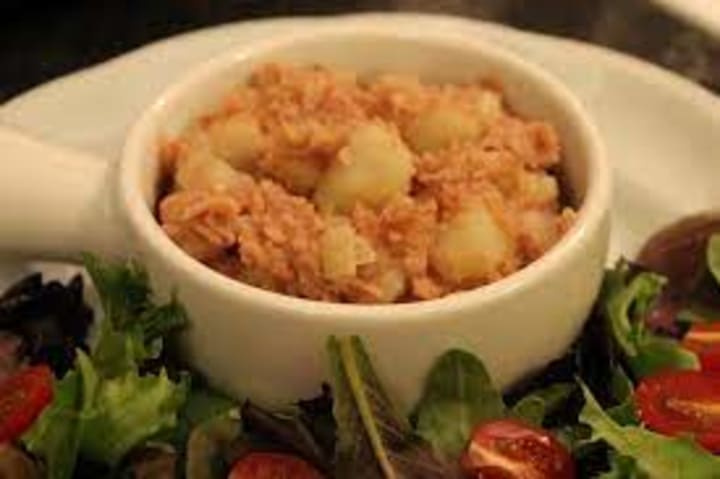 Tweed kettle or salmon hash is a dish prepared with poached salmon served in a flavorable fish broth and accompanied by potatoes or mushrooms. The salmon is poached with fresh herbs and spring onions.