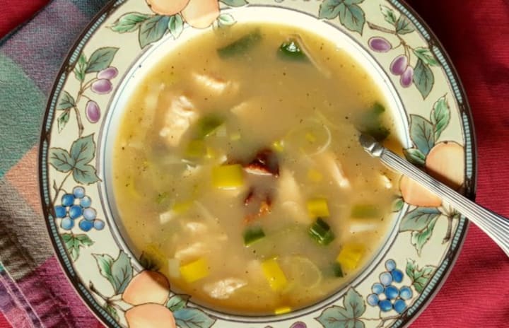 Cock-a-Leeky is a traditional Scottish rooster and leek soup dating from the 18th century. The dish was served as a two-course meal with first the broth and then the meat.