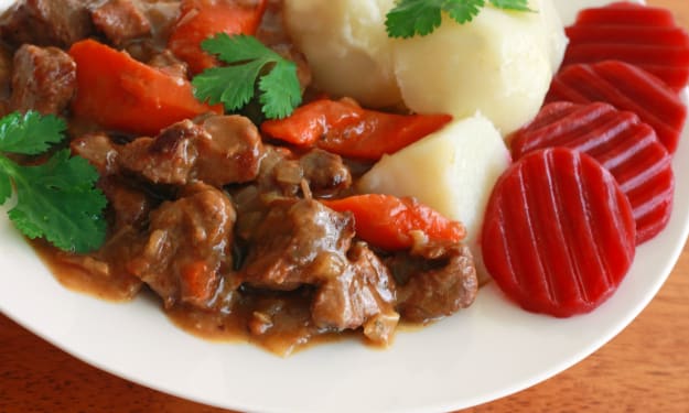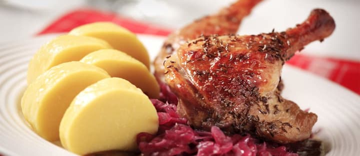 Pecena kachna is roasted duck in the Czech Republic. The dusk is seasoned with caraway seeds and marjoram. It is slowly roasted in the oven until golden brown. The dish is served with potatoes, bread dumplings, braised red cabbage, and a thick sauce prepared with duck fat and flour.