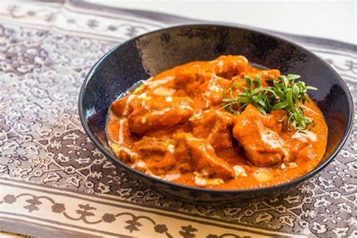 Chicken tikka masala is a dish influenced by Indian cuisine. It is a combination of marinated tandoor-cooked chicken pieces in a spiced tomato-cream sauce.