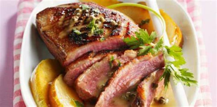 Magret de canard is a dish made with flash-seared duck breast. The duck meat is thinly sliced and still pink inside. It is usually made with the mulard duck, a cross between the Pekin and Muscovy duck. It has thicker breast meat.