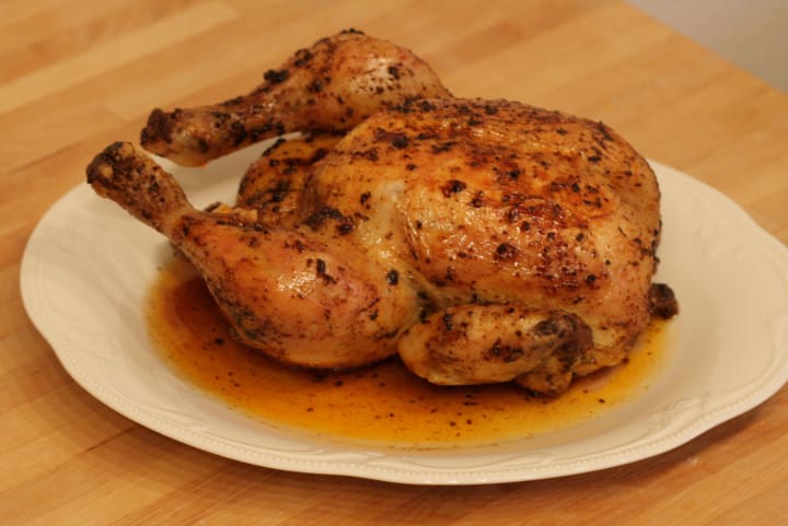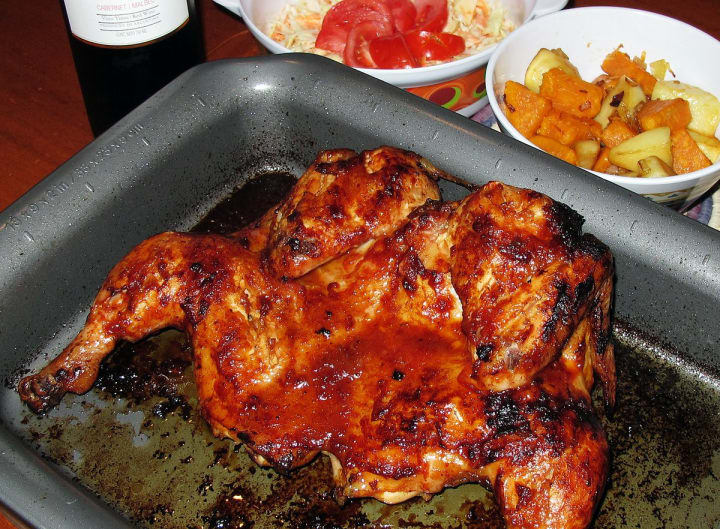 Frango assado com piri piri is a dish made with a whole butterflied chicken marinated in olive oil, seasonings, and crushed piri-piri peppers. After the chicken is roasted it is served with a piri-piri sauce made with dry or fresh chili peppers and oil.