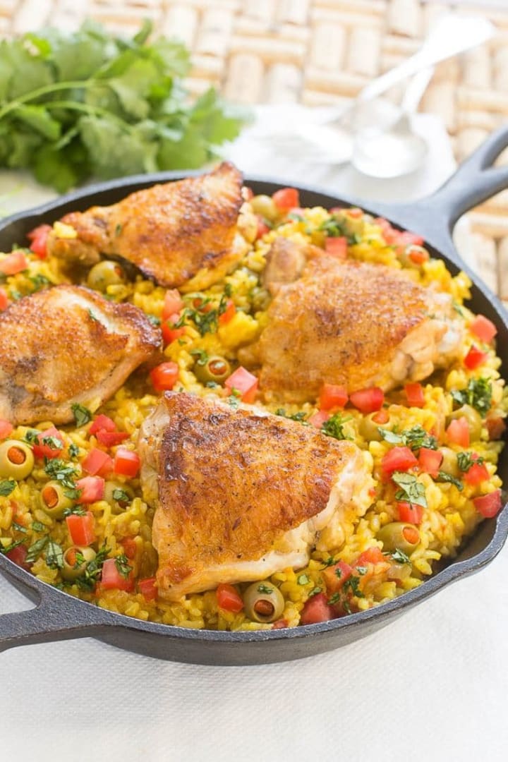Arroz con pollo is a dish that originated when Spain was under Moorish influence. The dish consists of chicken, rice, stock, beer, sofrito, and spices like saffron, cumin, and coriander.