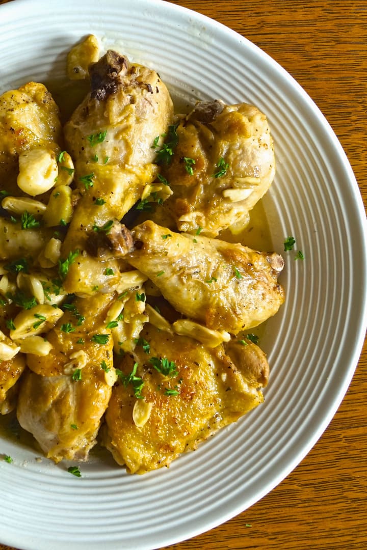 Pollo al ajillo is a dish made with chicken pieces in garlic sauce. The sauce consists of white wine, stock, garlic, and herbs like bay leaves, thyme, and rosemary. It can be eaten as a main meal or as a tapa.