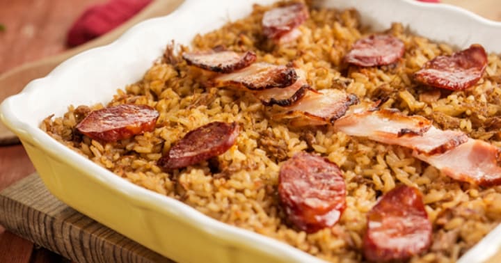 Arroz de pato is a traditional dish consisting of flavorful duck meat and rice. A whole duck is cooked in seasoned stock with smoked meat and sausages. Shredded duck meat is placed in a clay pot and topped with rice and cooked in the same broth. Before baking the dish is topped with sliced sausages or pieces of smoked meat.