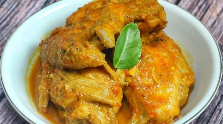 Gulai ayam is a traditional curry-like dish. The dish is prepared with pieces of chicken simmered is a spicy sauce made with coconut milk and spices like chili, turmeric, coriander, cumin, and nutmeg. It is served with steamed rice on the side.