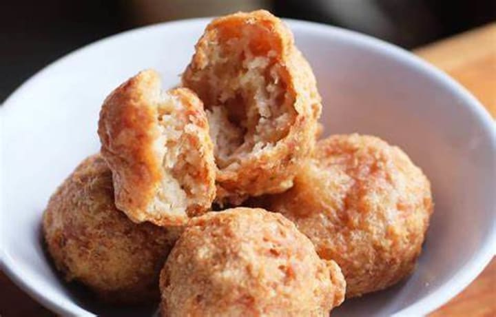 Bakso goreng are fried meatballs eaten as a snack of Indonesian-Chinese origin. The meatballs are prepared with a combination of chicken, beef, fish, shrimp, and pork. The ground meat is mixed with peppers, garlic, sesame oil, flour, eggs, starch, sugar, and salt. The deep-fried until golden brown and crispy.