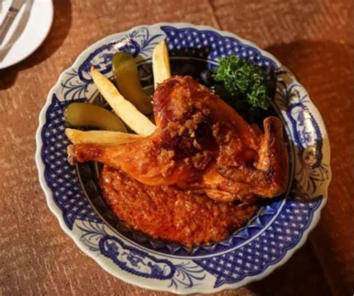 Crispy fried chicken is a traditional Cantonese dish. The chicken is first steamed and dried, then deep-fried in a way that the skin stays crunchy and the meat is tender. The chicken is steamed with spices like cinnamon, Sichuan pepper, ginger, anise, and nutmeg. Then the chicken is drizzled with a combination of vinegar and sugar.