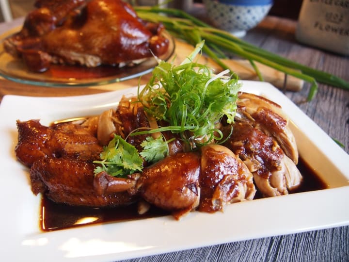 Soy sauce chicken is a traditional dish originating in northern China. This dish is a classic example of red-cooking technique with the chicken simmered in a soy-based liquid along with seasonings.