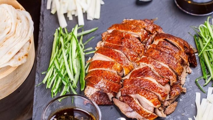 Peking duck has a history dating back to the Yuan Dynasty of the 13th century. The duck is cooked until the skin becomes golden and crispy leaving the meat tender and moist. The duck meat and the skin are folded into thin pancakes or steamed white buns.