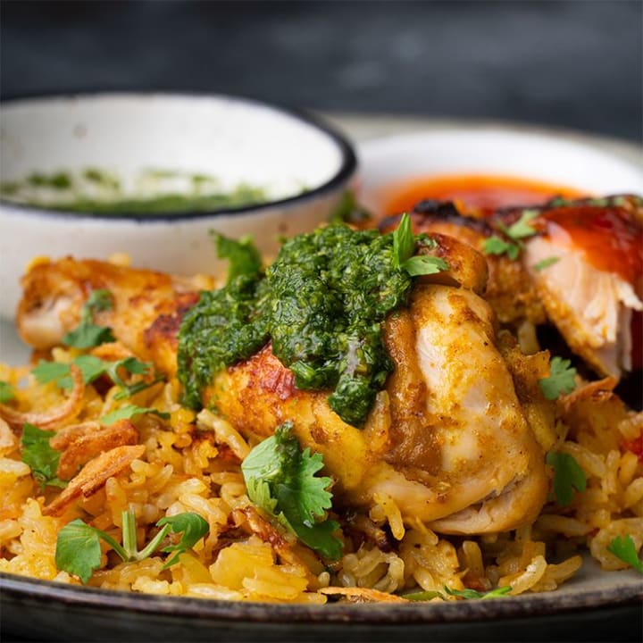 Khao mok gai translates into chicken buried in rice. Both the chicken and rice are heavily seasoned with traditional biryani spice like curry powder, coriander, cardamom, turmeric, cumin, and cinnamon. The dish is served with fresh tomatoes or cucumbers on the side and nam jim dipping sauce with fresh mint and ginger.