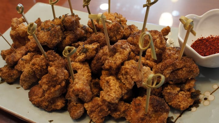 Chicken fingers originated in the US. White poultry meat is cut into strips, coated in breadcrumbs, and deep-fried in hot oil. They’re served as an appetizer or snack with various dips like ketchup, mayonnaise, honey mustard, or barbecue sauce.