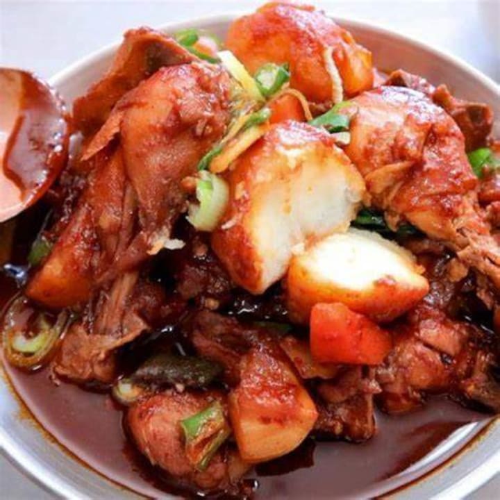 Dakbokkeumtang is a dish that is prepared with chicken pieces, potatoes, onions, and carrots stir-fried with soy sauce, gochujang (fermented sauce), and garlic.