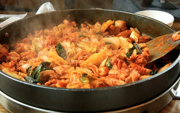 Dak galbi is a stir-fried dish that is cooked at tableside on large cast iron skillets. It includes various chicken pieces, cabbage, tteok rice cakes, carrots, chili peppers, and sweet potatoes. A spicy sauce is added made with spicy chili paste, chili flakes, soy sauce, garlic, ginger, and onions.