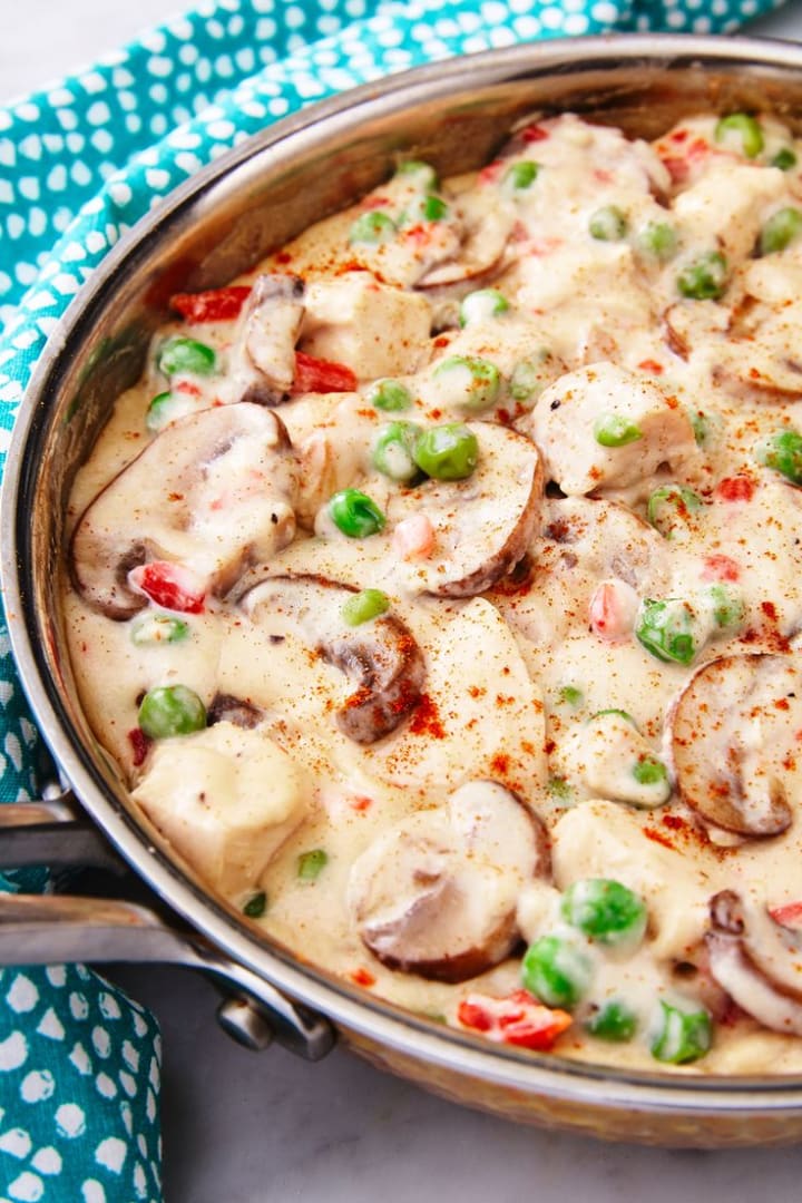Chicken a la king is a dish prepared with diced chicken meat, cream sauce, vegetables, and sherry mushrooms. It is served over rice, noodles, or buttered toast.