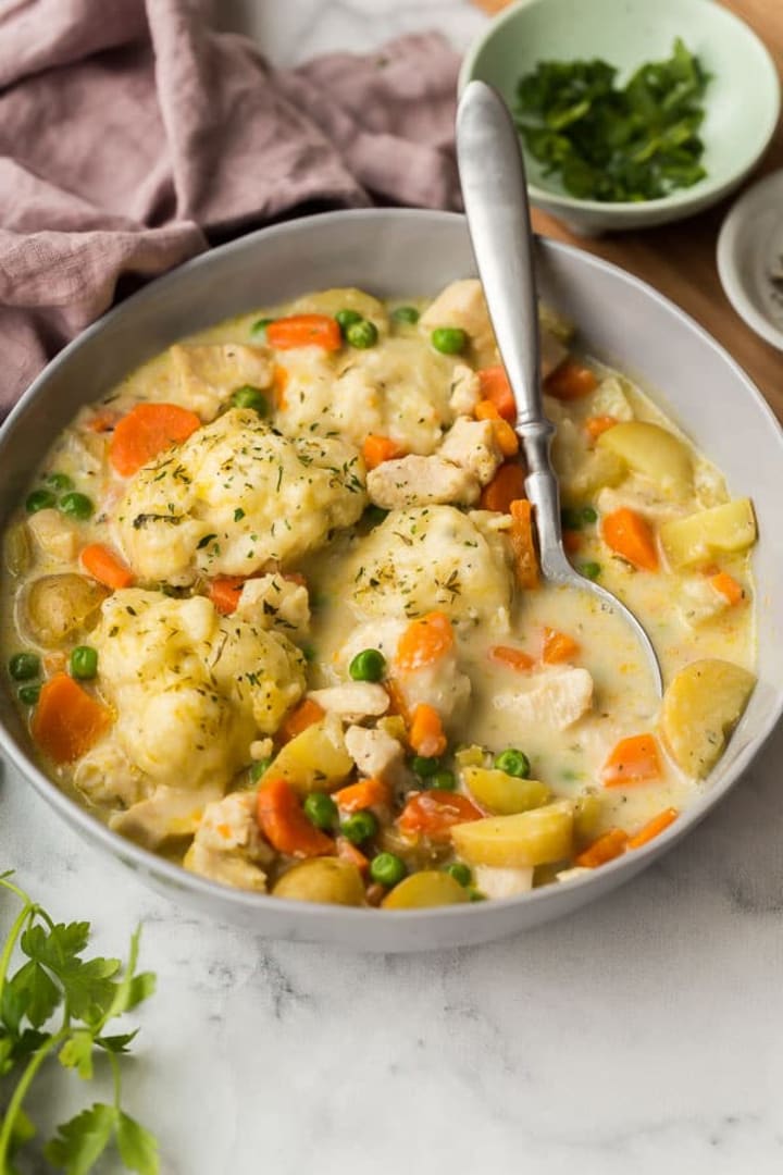 Chicken and dumplings is a dish made with water-cooked chicken and dumplings made with flour, shortening, and liquid. Once the chicken is cooked the dumplings are added to the leftover chicken broth and served with the chicken.