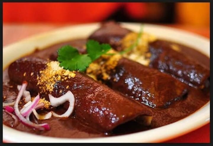 Mexican enmoladas are enchiladas covered with mole sauce. The tortillas are fried, dipped into warm mole sauce and filled with chicken and cheese.