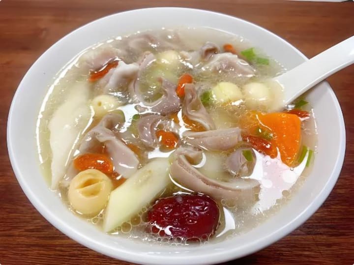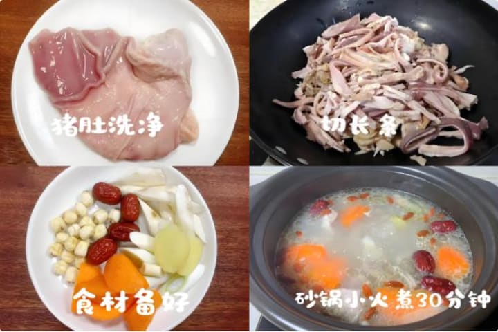 This hearty soup is simpler to make than it sounds! Clean and slice pork stomach, then simmer it into a rich broth. Add cubed yam, carrots, heart-clearing lotus seeds, blood-nourishing goji berries, and red dates. Simmer on low heat until the yam turns soft and the pork stomach becomes tender. The result? A thick, savory broth with melt-in-your-mouth yam, chewy pork stomach, and a subtle sweetness from lotus seeds and dates—comforting and deeply nourishing for the entire body.