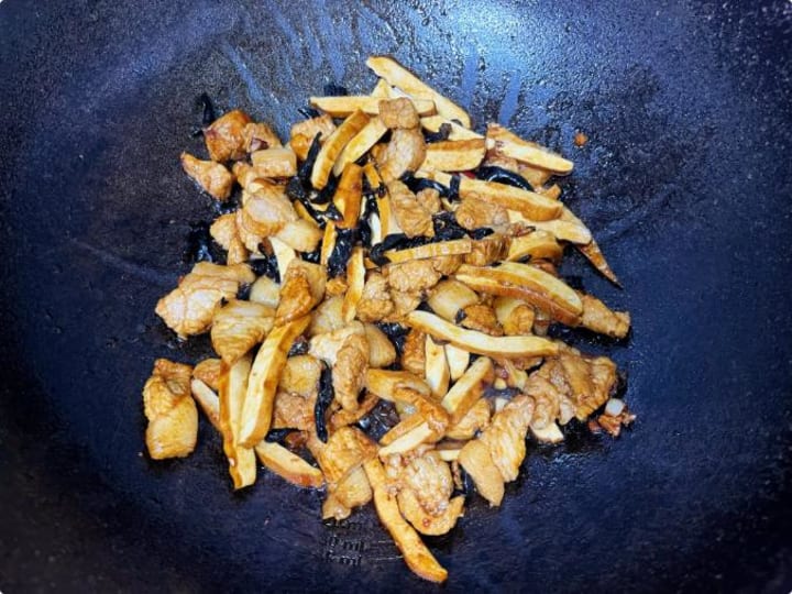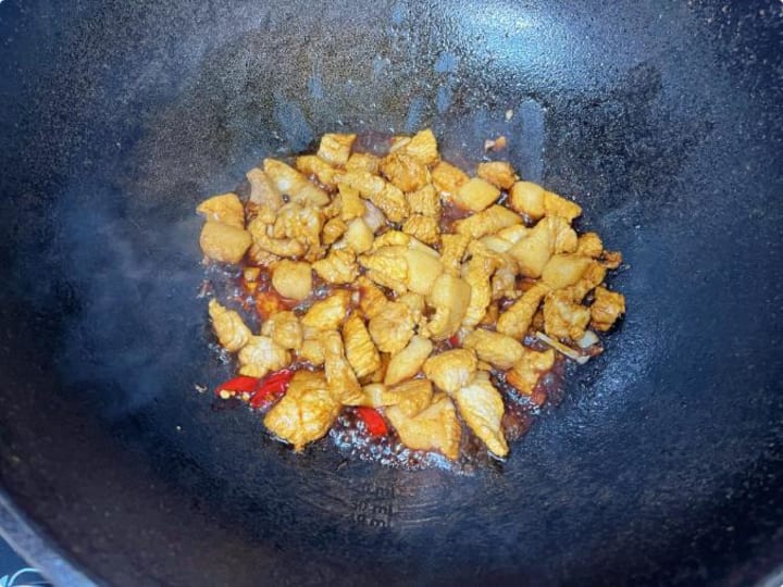 • Step 1: Heat oil, sauté ginger/garlic until fragrant. Brown pork (1-2 mins), set aside.