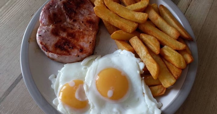 * Gammon, fried eggs and chips (no mushy peas please). Gammon is a cut of pork, salty and thick like a steak, and I have never found it in the USA, so whenever I go home, I seek out a pub and have this as one of my favorite meals to enjoy back home. It's delicious and really easy to make. Any good pub who knows how to please their punters will have this on the menu. I favor the wide cut chips (aka french fries) and can do without the roast tomato, but many places add one for color!