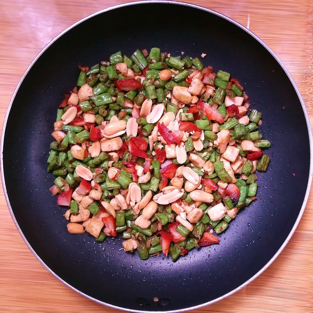 It is a tasty nutritious dish that is extremely easy to make. The main ingredients are Chinese long beans (or yard-long beans) and dried tofu (the firm type), all diced and stir-fried in vegetable oil with garlic and seasoned with light soy sauce and sesame oil. Char siew (Cantonese for barbecued pork, also diced), chai po (Hokkien for preserved radish) and roasted peanuts are then added to the mix, producing a multitude of flavors including sweetness, saltiness and savoriness all in one dish.