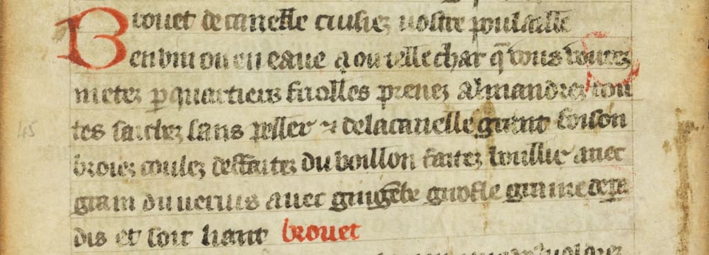 Although Taillevent is often credited as the author and origin of most of the recipes in these Viandier compendiums, his life seems to post-date the oldest of the collections. Taillevent lived between 1310 and 1395, whereas a collection contained in the Sion manuscript dating from the late 1200's repeats verbatim many of the formulae found in the later texts traditionally attributed to him. A recipe like brouet de canelle could therefore date anywhere from decades to centuries earlier.