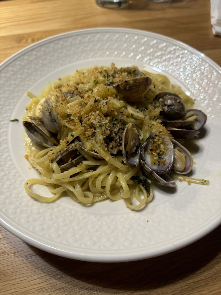 We put on our order for our main dishes. Everything on the menu sounded so absolutely fantastic. I ordered the vodka sauce fuccelli. my wife ordered the chicken Parmesan. My other guest ordered the a brace pork shoulder with saffron rice. We also ordered a chicken Milanese dish and lastly linguine clam sauce. we also ordered for the table a bread that consisted of truffle cream, prosciutto, and Stracietella.