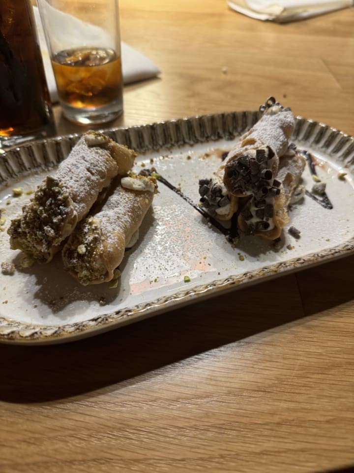 I don’t know why we did this but my guess also wanted to order dessert. I did not want to give this place anymore money because everything was just that bad but we ordered desserts with cannoli. We also ordered a sticky toffee cake tiramisu chocolate gelato. Everything was not good except for the toffee cake. I don’t know how it’s possible, but the inside of my cannoli filling was warm, the cannoli was obviously in a bag was just sitting out not being chilled.