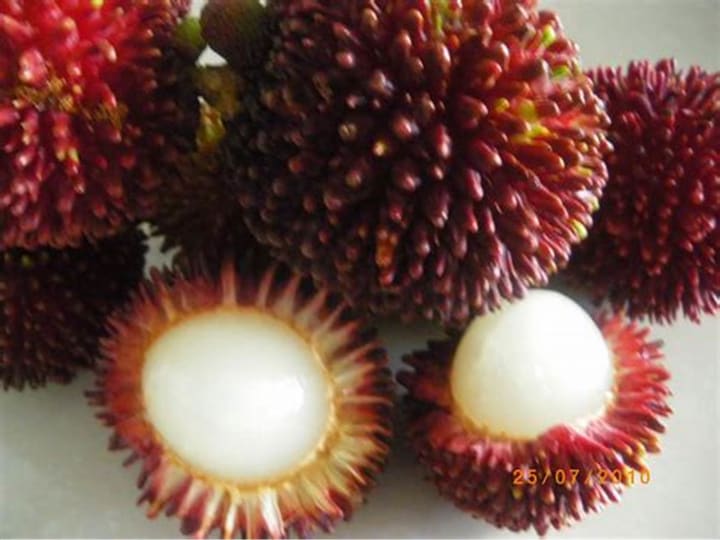 Pulsan is the fruit of an evergreen tree with a short trunk native to western Malaysia and Singapore. The fruit is oval, dark red to red or rarely yellow and has a thick leathery exterior covered in short and soft spines. The pulp is sweet and juicy with one seed. The fruit is eaten fresh or made in jam, It is a great source of calcium, Vitamin C, and carbohydrates. The seeds are edible when row and reminiscent in flavor of almonds.