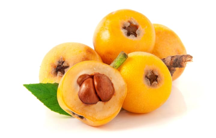 Loquat are large evergreen shrubs or small trees native to southeastern China. The fruit are round, oval, and pear-shaped. The flesh of the fruit is sub-acid to sweet in flavor and very aromatic. The ripe loquats are eaten fresh or used in fruit salads. They can be pickled, stewed for desserts, preserved with spices and used in sauces and chutneys. They have a high pectin content so are also used to make jams and jellies. They can be ferments to produce fruit wine.