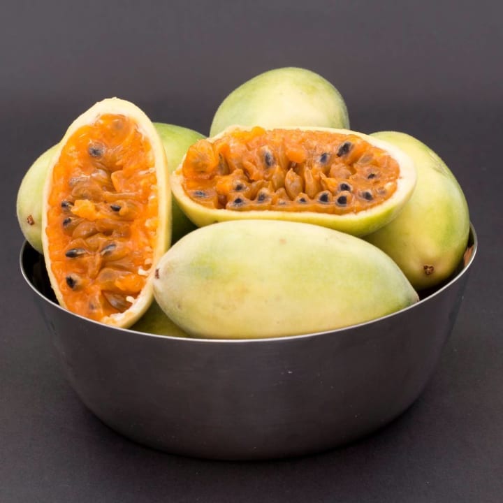 Banana passion fruit is a tropical fruit of the passion fruit family. It has an oval shape and light yellow to orange-yellow leathery skin. The fruit got its name because it resembles a small banana. The flesh is juicy and the orange pulp has many small black seed. Its fragrance is like organges and it taste sweet, tangy, and tart.