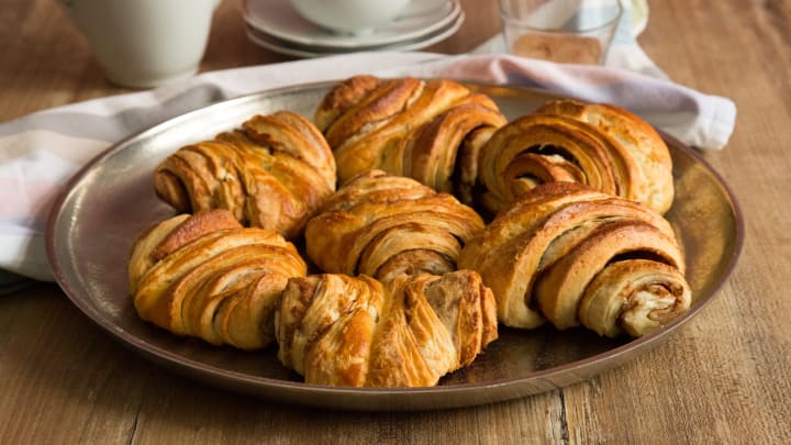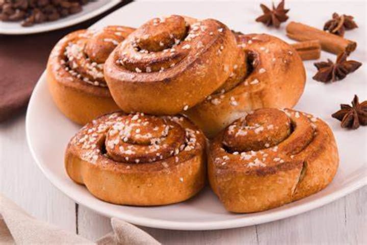 Kanelbulle are sweet cinnamon rolls. They’re prepared with a dough made of yeast, butter, and cardamom. The dough is filled with cinnamon, butter, and sugar. The rolls are baked to a golden brown.