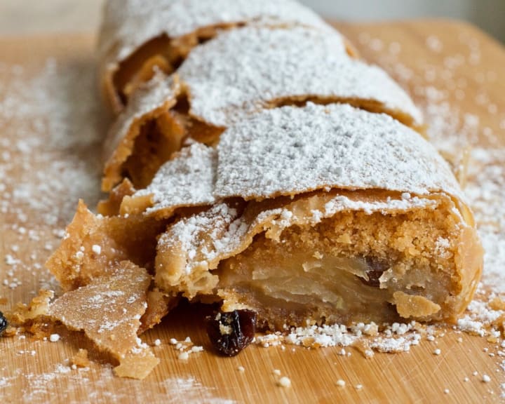 Apfelstrudel is a delicious apple pastry that originated in Vienna. Thin layers of dough are filled with a flavorful apple filling. The strudels can include raisins, cinnamon, rum, and nuts as well.