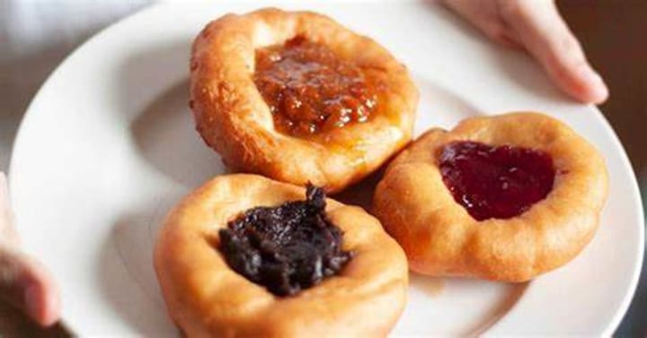Vdolky are Czech doughnuts made with yeasted dough. They are round with an indentation on top to be filled with jams. The vdolky are fried in oil until golden brown.