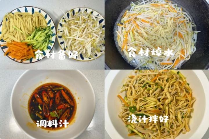 4. Place the prepared mung bean sprouts, tofu skin, carrot, and cucumber strips in a large bowl.