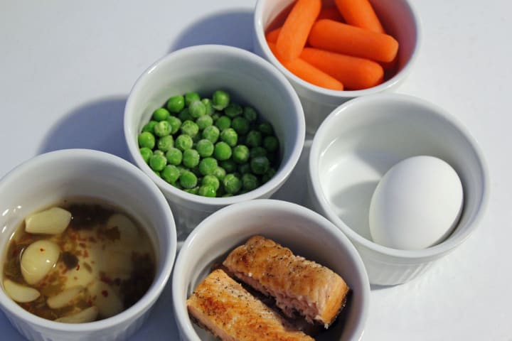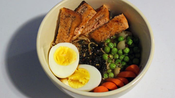 My selections were: pickled garlic, peas, baby carrots, pan-seared salmon, and a medium-boiled egg. I'd suggest cooking the proteins while you're preparing the noodles. Maybe even start them a bit before. Or, if you're really wanting to lower the work load, check to see if you have any leftovers that you can re-heat and throw into your Ramen!