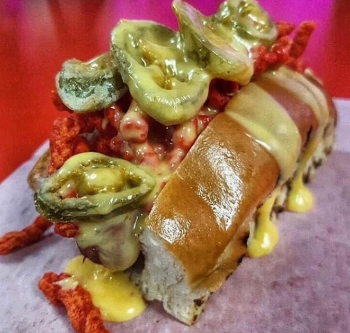 Spiked hot dogs are turnin’ up the heat! Start by placing savory franks on the grill with low flame. You may also boil the franks or bake on the stove depending on preference. Preheat the oven to 350 degrees fahrenheit and warm up the condensed cheese on the stove. Check the franks and rotate to get a good crispy cookin’ all around. Grab your melted butter and begin buttering the inside of the hot dog buns. Once buttered, place on a cooking sheet and let bake for 6 minutes for a nice toasty texture. After everything is finished, put together your personalized dog. Spiked hot dogs include ketchup, mustard, cheese, Hot Cheetos, and jalapeno slices inspired by The Dogfather in San Antonio, TX.