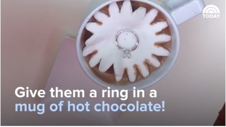 If you happen to live in Los Angeles, New York City, London or Tokyo, you can visit Dominique Ansel’s Bakery and order a hot chocolate with a blossoming marshmallow (which is perfect for hiding a ring inside!) Granted this isn’t an original idea, but it’s sure to melt his or her heart!
