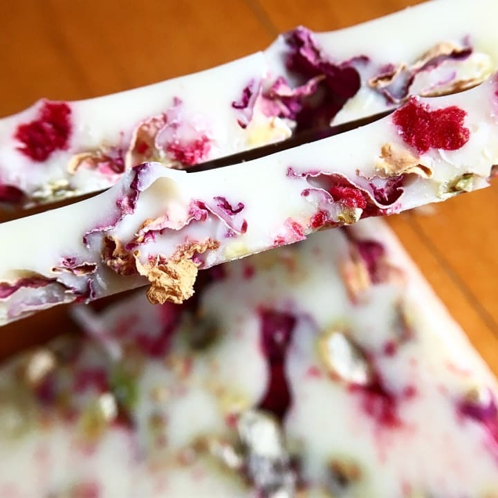 Los Angeles, California-based Valerie Confections offers a 33 percent white chocolate bar called Blushing Berry that has pistachios, freeze-dried raspberries and dried rose petals. At a $10 per bar, you can afford to splurge on more than one for the same price you would have paid for those flowers!