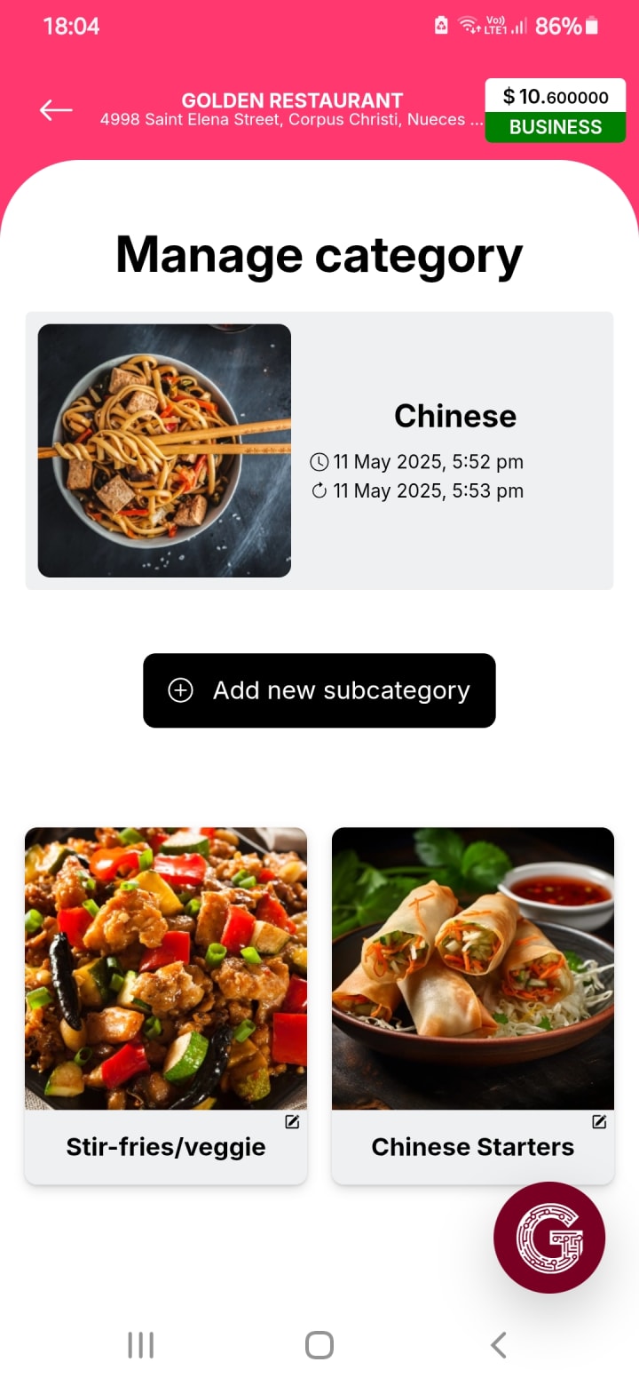 Create structured menus with categories, subcategories, product images, SEO tags, and pricing.