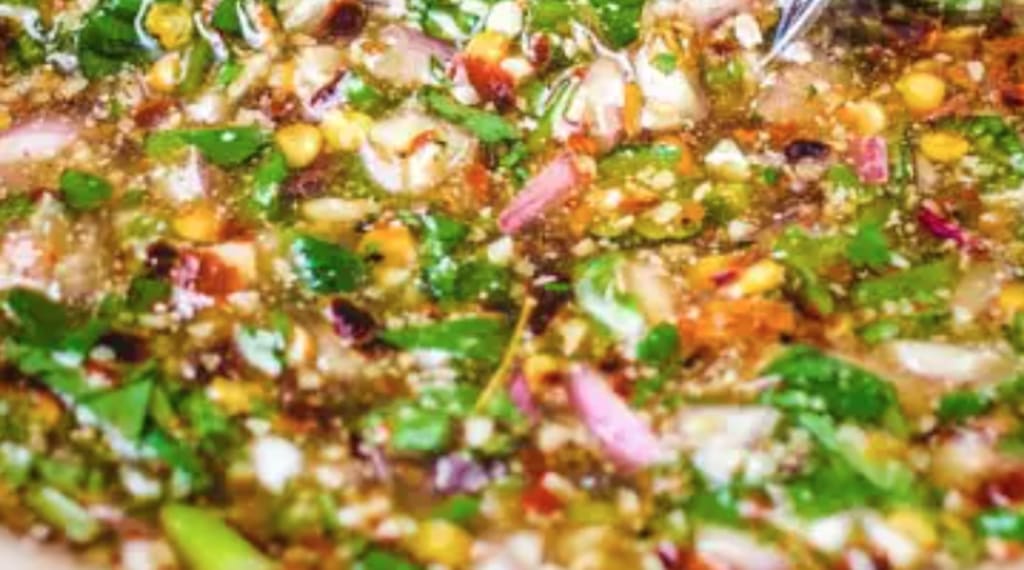 A half ounce of finely diced shallots, a quarter cup of finely chopped cilantro, the juice of one whole lime, a tablespoon of fish sauce, two tablespoons of apple juice, one teaspoon of fried red pepper flakes, and a tablespoon of sticky rice, toasted and powdered. Mix these all together and you will be granted with a simulacra of one of the most flavourful and versatile sauces on this planet.