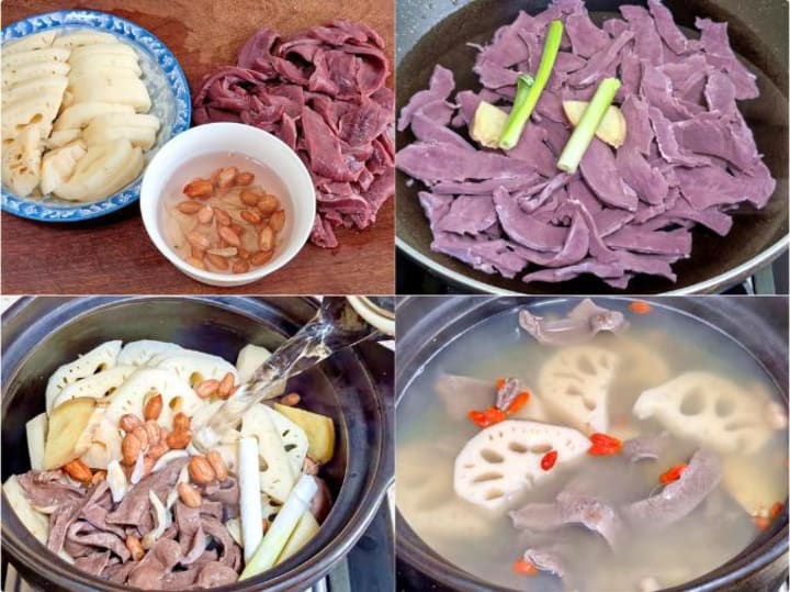 4. Simmer: Add pork heart, lotus root, peanuts, and ginger to a clay pot with enough water. Simmer on low heat for 1 hour.