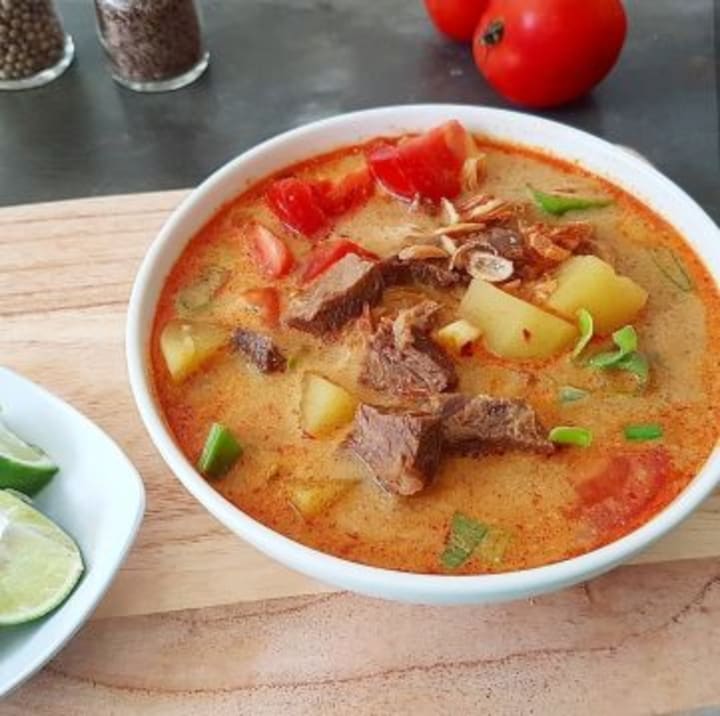 Soto betawi is a hearty and flavorable beef soup that is prepared with chunks of meat and offal, slowly simmered in a coconut milk broth that is flavored with spices like lemongrass, turmeric, galangal, kefir lime leaves, and coriander. Upon serving soto betawi is accompanied by such condiments as tomatoes, scallions, sweet soy sauce, and emping crackers (a bite-sized snack cracker with a slightly bitter taste.).