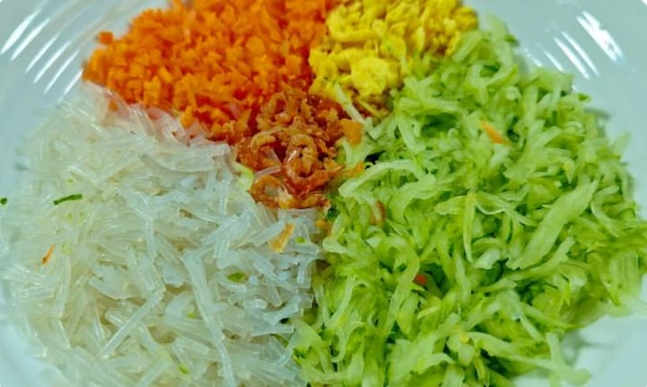 In the large bowl with the squeezed cucumber shreds, add the cooled egg crumbles, chopped noodles, chopped dried shrimp, shredded carrot, and 2-3 tablespoons toasted sesame oil. The oil coats the vegetables, creating a barrier against moisture release. Add 1-2 tablespoons of the reserved shrimp soaking liquid – this injects incredible savory depth. Season with salt to taste (start with ½ teaspoon, remembering cucumbers were pre-salted) and the optional white pepper.