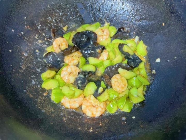 4. Combine Everything: In the same wok, stir-fry the wood ear mushrooms for about a minute until they crackle. Return the luffa and shrimp to the pan. Toss everything together, season with salt, and splash in a little Shaoxing wine or water for aroma. Stir-fry over high heat for another 30 seconds to blend the flavors.