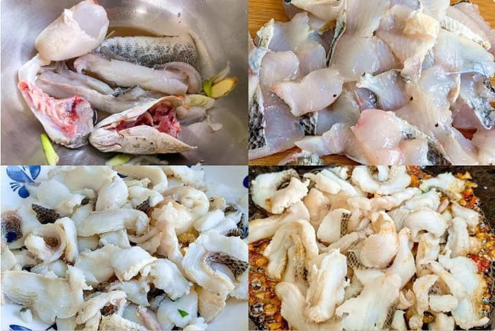 1. Have the fish scaled, gutted, and cleaned. Scrape off any mucus, then fillet and slice thinly. Marinate with salt, cooking wine, ginger, and starch for 10 minutes.